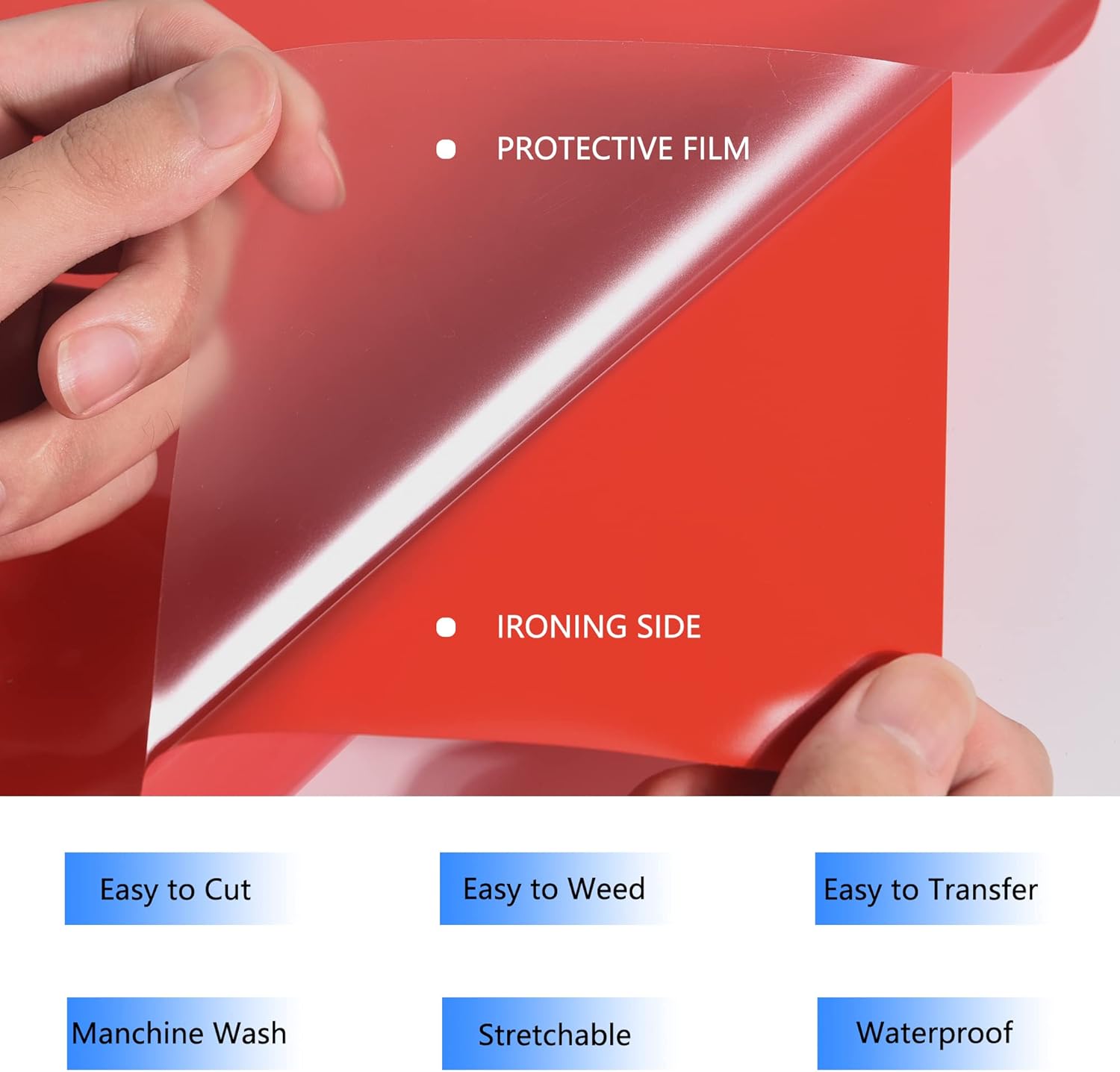 - Glossy heat transfer vinyl HTV: Our Red htv iron on vinyl is made out of the highest quality polyurethane that is incredibly strong, durable and vibrant fine Using the special technology, the htv is thin and extremely durable and soft. The whole weeding process just like a breeze at the help of sticky back.