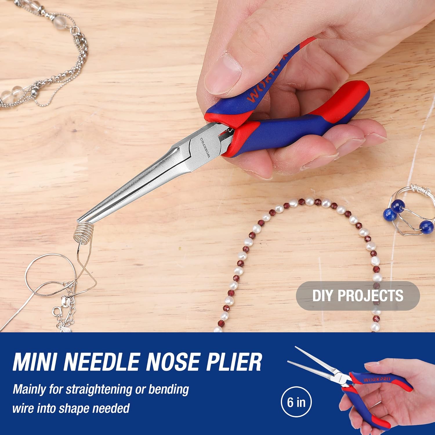 WORKPRO Mini Pliers Set, 3-Piece Small Pliers Tool Kit Includes 4” Diagonal Plier, 5” Long Nose Plier, 6” Needle Nose Plier, for Making Crafts, Repairing Electronic Devices