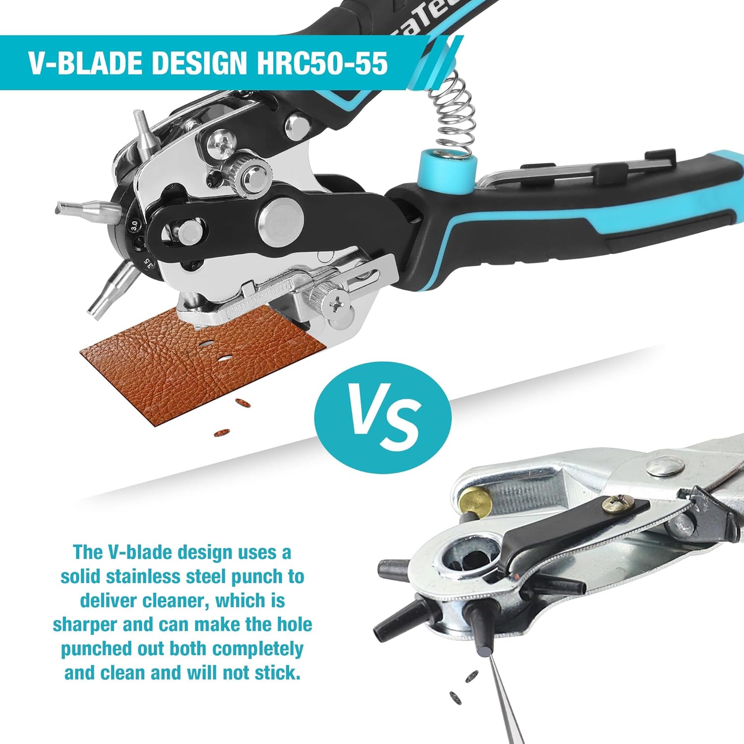 - V-SHAPED CUTTING EDGE DESIGN: The durable leather punch is made of high hardness and durable stainless steel. With V-shaped needle design, which is sharper and can make the hole punched out both complete and clean and will not stick.