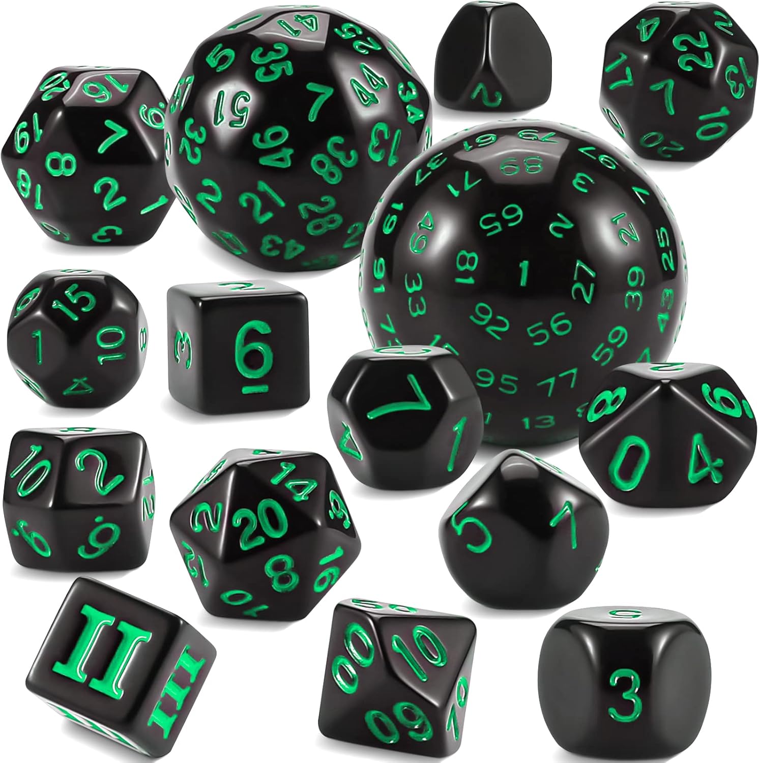 CiaraQ DND Polyhedral Dice Set (15pcs) D4-D100 Game Dice with Dice Bag for Dungeons and Dragons Role Playing Table Games (Black & Green)