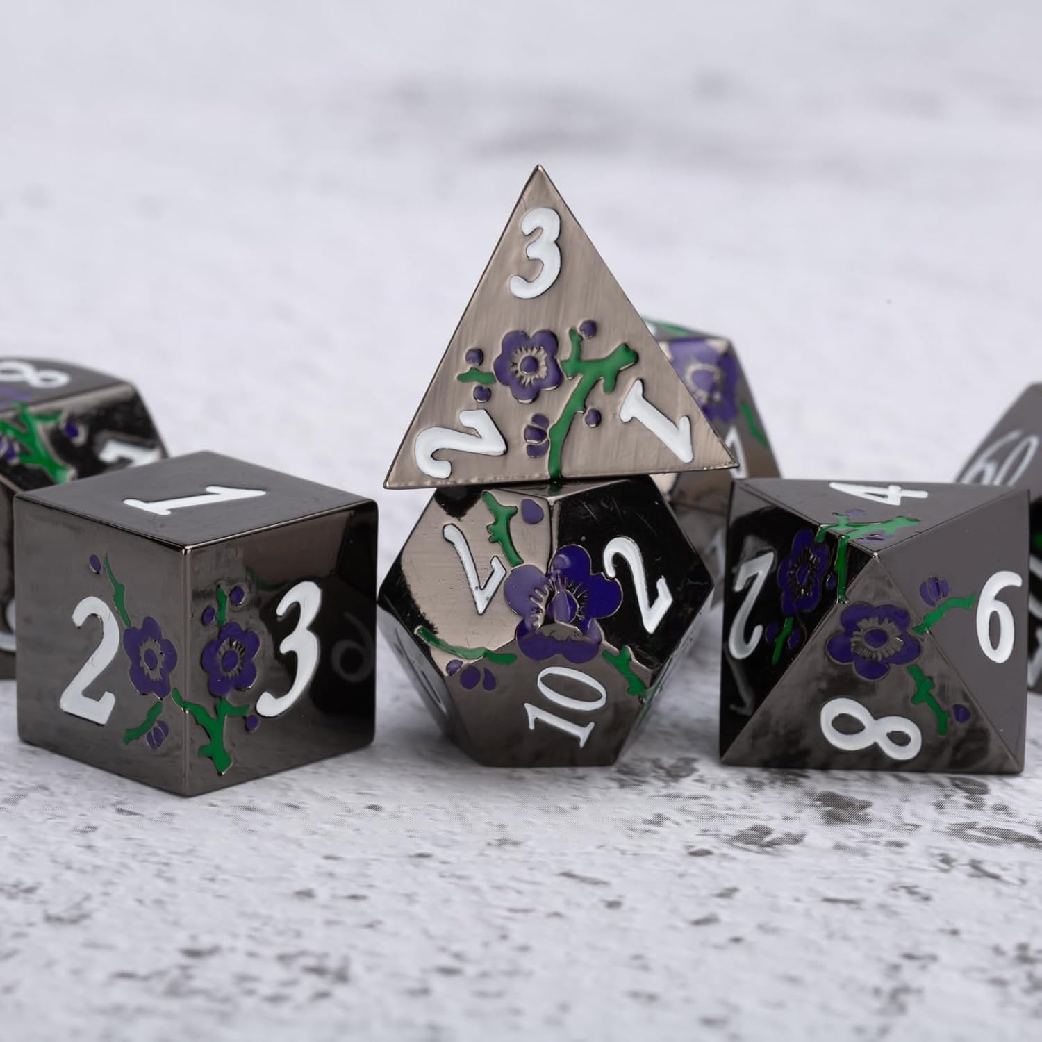 Black Metal Dice Set D&D,7pcs RPG Metal Flower Dice Set with Gift Box,RPG Polyhedral Metal Dice for Table Game(Black Nickel - Purple Green)