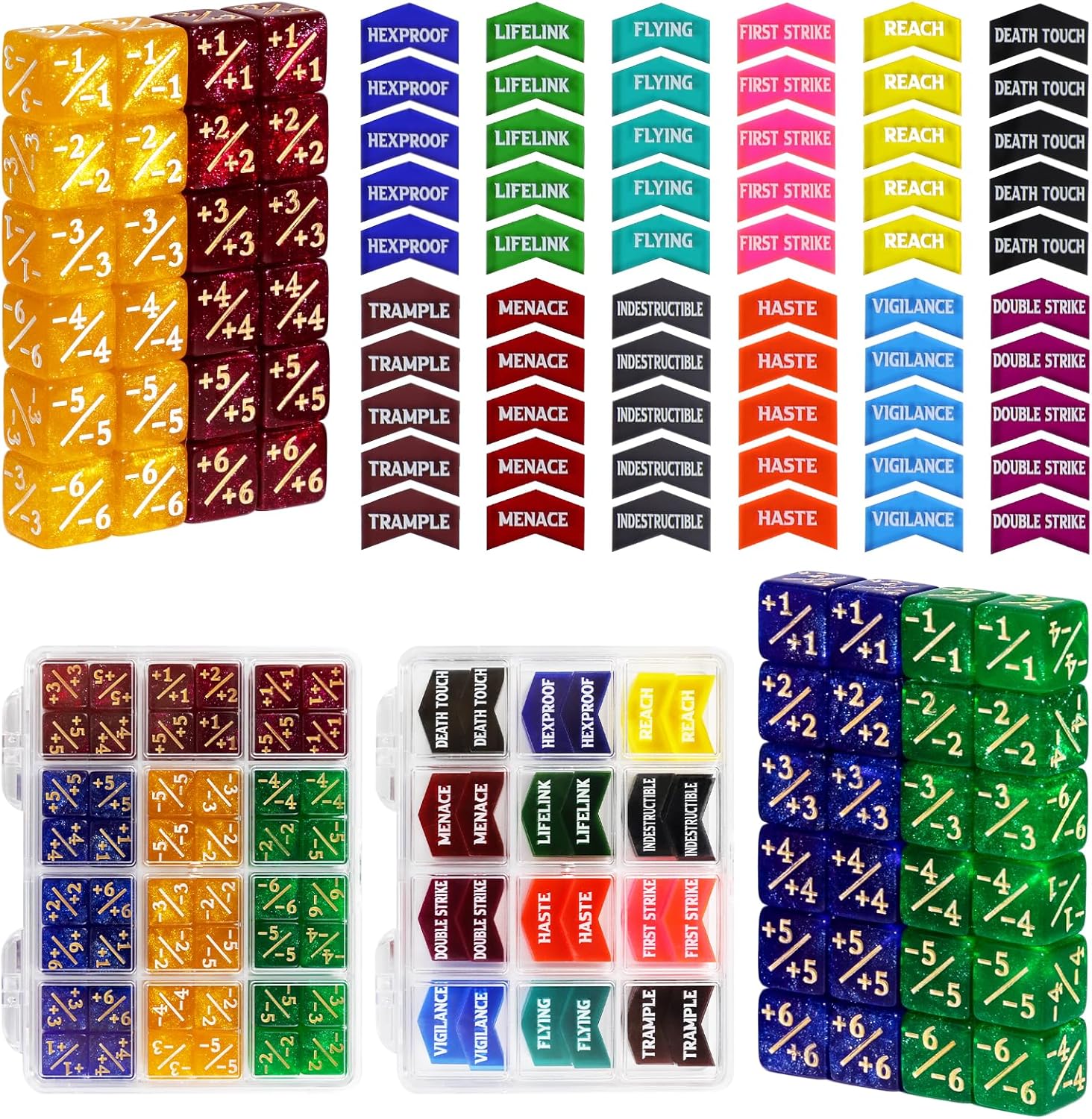 - PACKAGE INCLUDED - Comes with 60pcs MTG tokens & 48pcs 12mm MTG dice set. MTG tokens include 5x First Strike, 5x Double Strike, 5x Indestructible, 5x Hexproof, 5x Haste, 5x Reach, 5x Lifelink, 5x Deathtouch, 5x Menace, 5x Trample, 5x Flying, 5x Vigilance. Dices include 48pcs dice counters(24pcs -1~-6 & 24pcs +1~+6). Note: Product includes counters and dices only. The game cards are NOT INCLUDED in this product!